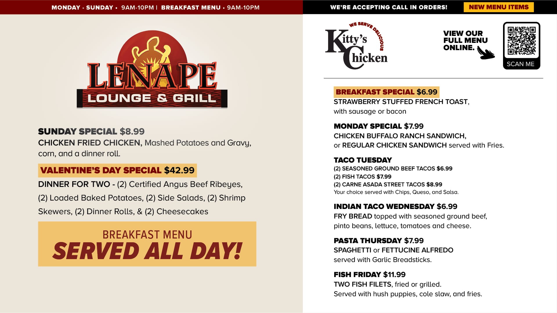 The Lenape Lounge serves your favorite beer, wine and mixed drinks. Grab some friends and come on down and watch your favorite sporting event on one of our SIX big screen televisions.