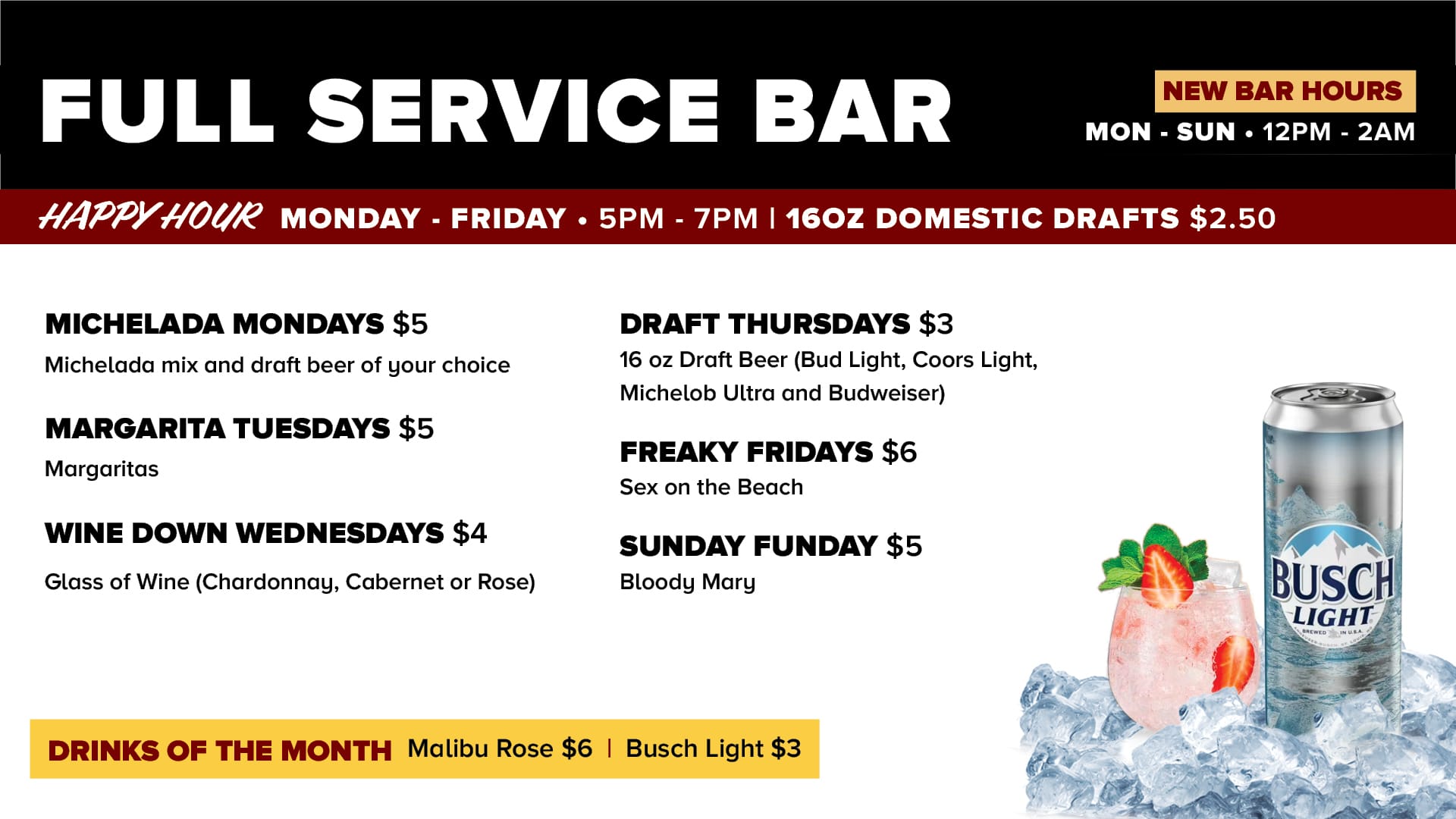 HAPPY HOUR – Monday through Friday 5pm to 7pm – 16 oz Domestic Drafts just $2.50