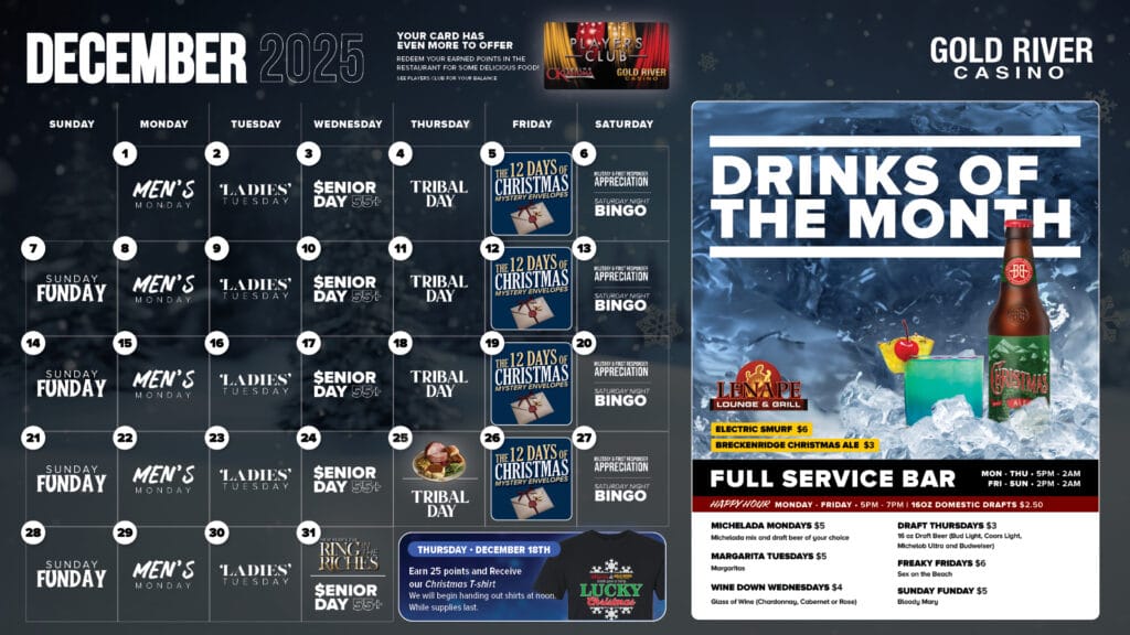 Gold River Casino is ready to celebrate the season with a festive giveaway you won’t want to miss! Join us on Thursday, December 18th for our exclusive 2025 Christmas T-shirt giveaway—designed to bring a little extra holiday luck to your wardrobe....