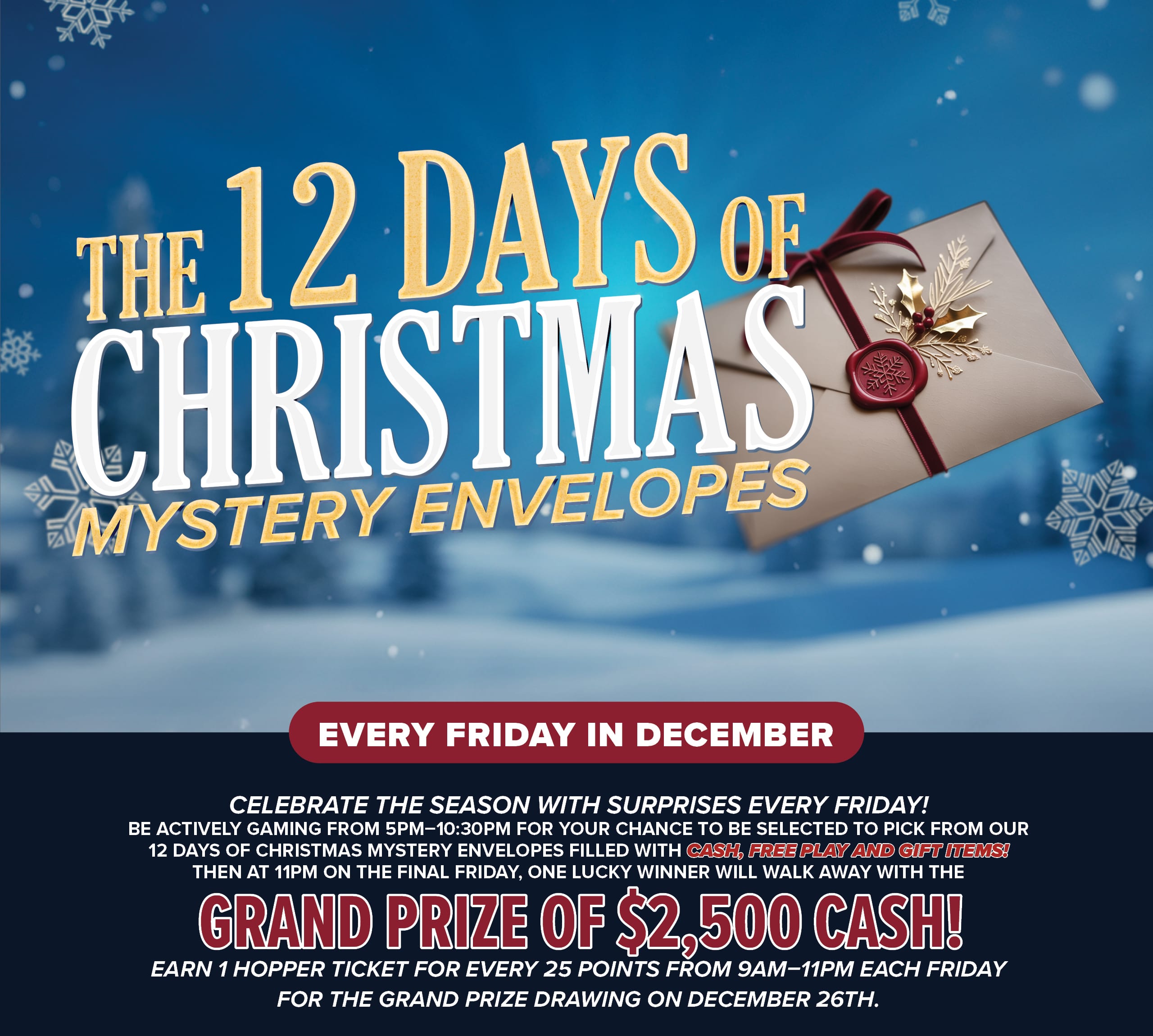 The holiday excitement is officially here at Gold River Casino, and we’re celebrating the season with our biggest and most festive event of the year — the 12 Days of Christmas Mystery Envelopes!...